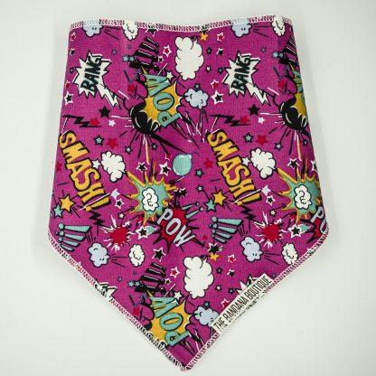 Comic book design with lettering in green, blue and gold, saying “Smash”, “Pow” and “Bang” with various bomb and explosion images on bright pink background.