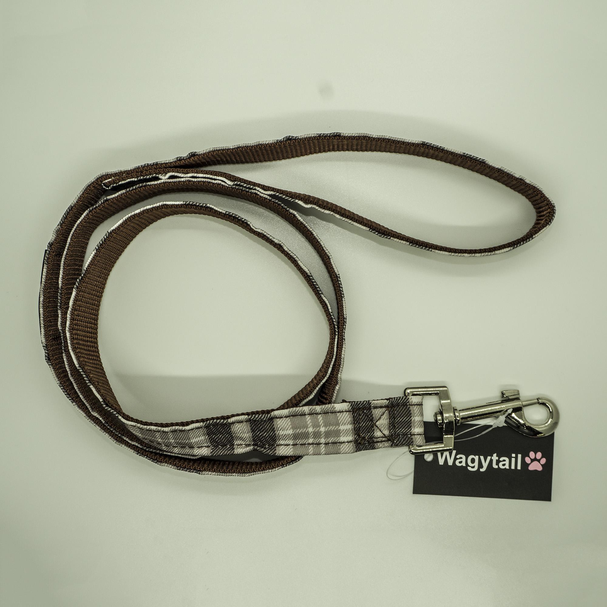 Wagytail Brown Gingham Lead. Strong chocolate coloured webbing lead with grey gingham check pattern cotton ribbon facing and small, neat but sturdy chrome trigger clip & loop handle.
