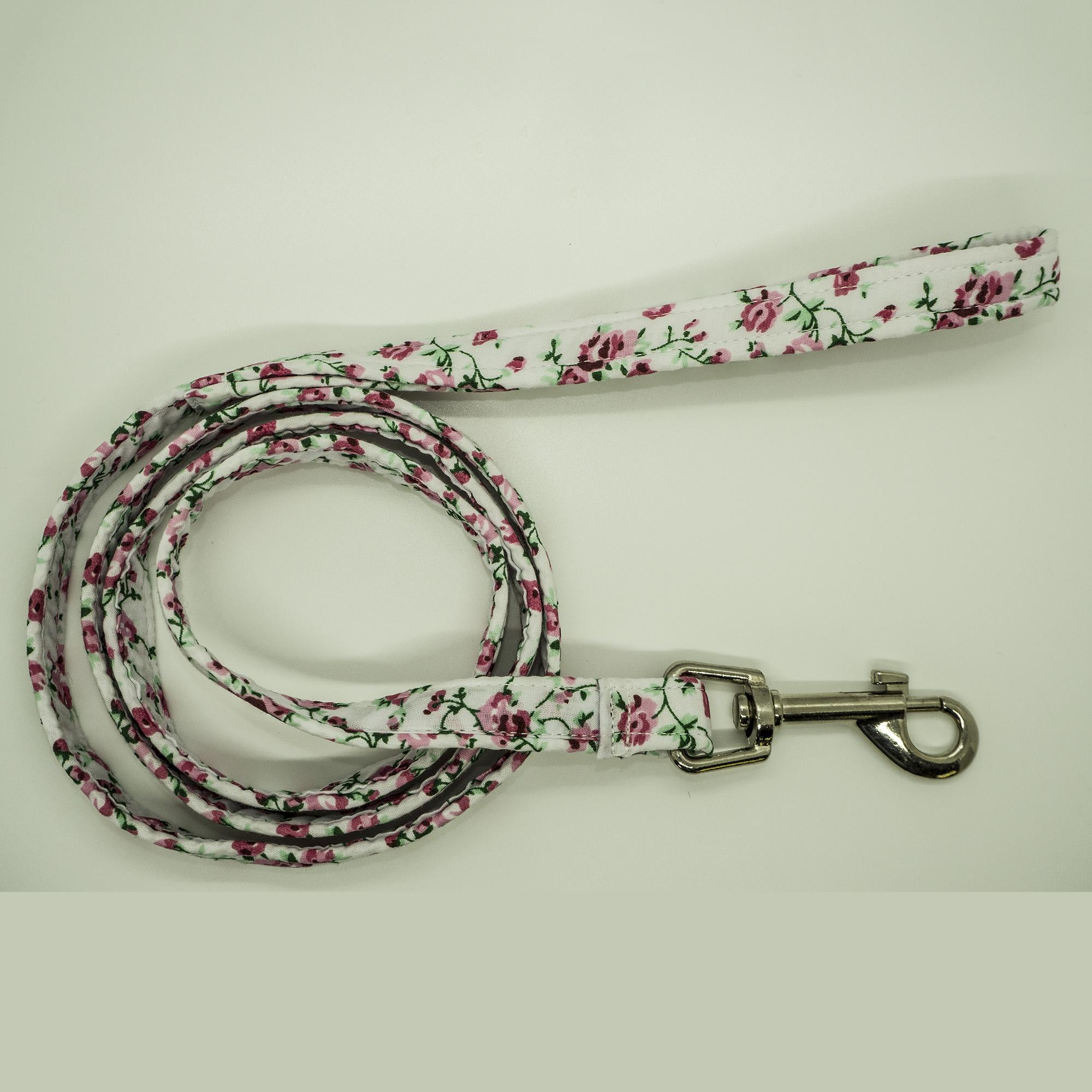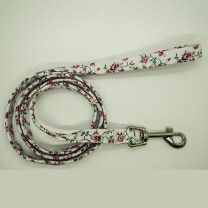 Wagytail Pink Floral Lead. Strong white cotton lead with pretty pink floral pattern and small, neat but sturdy chrome trigger clip & loop handle.