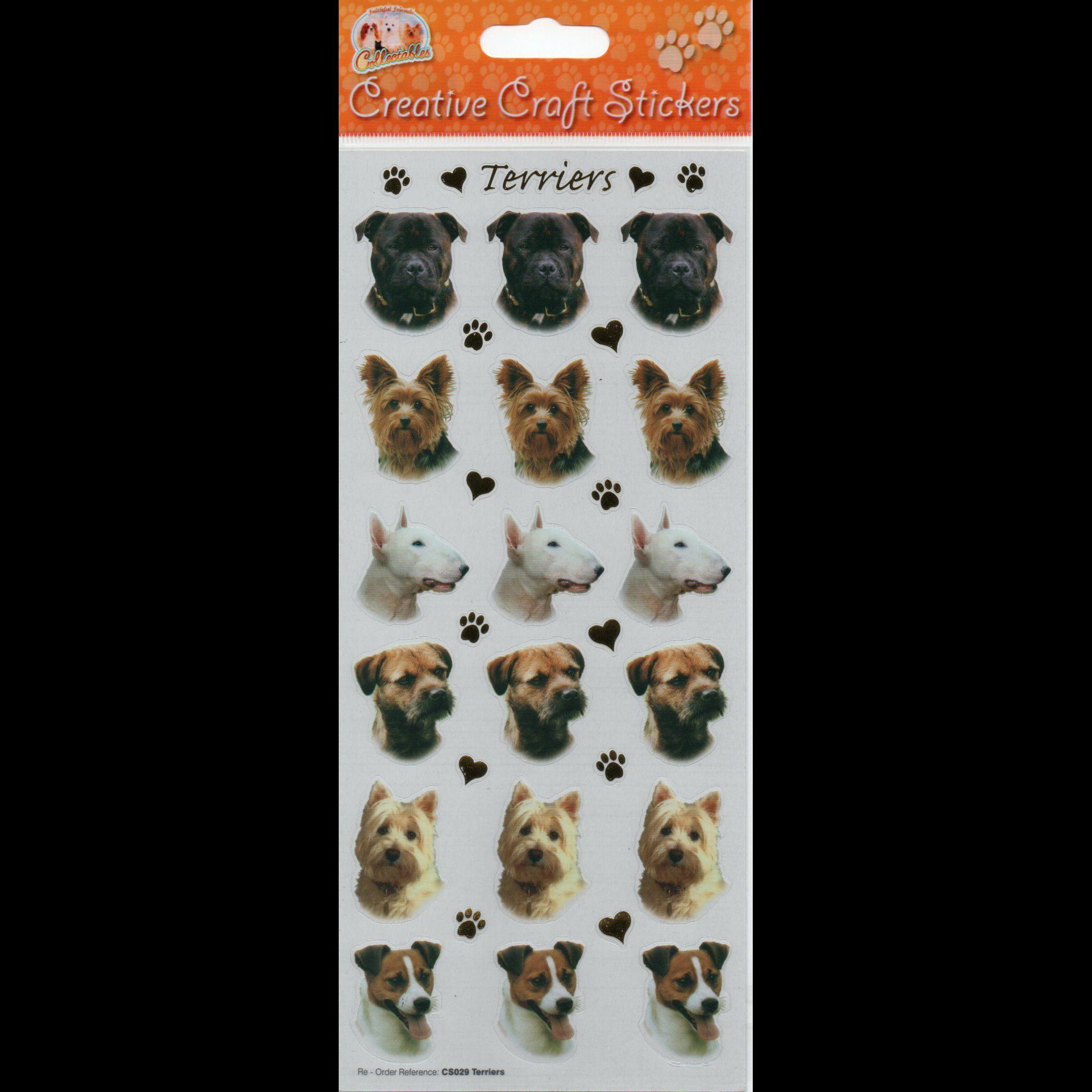 33 miscellaneous terriers, paws and hearts self adhesive stickers in each pack.