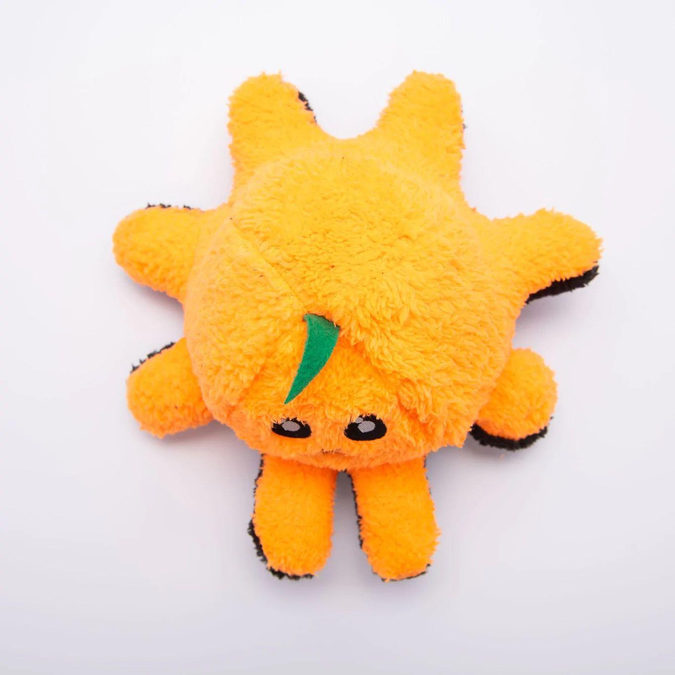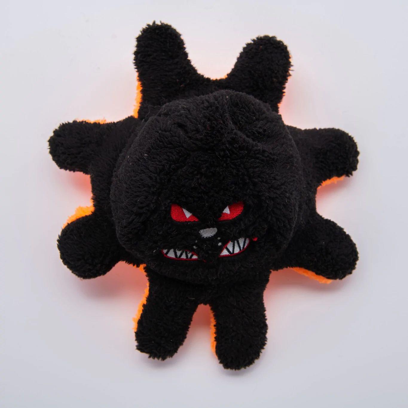 One way up is a smiling orange face – the other way up is an angry black face. The toy is stuffed with a crinkly material that will entertain you pooch. The eight legs alternate between crinkles and squeakers to stimulate play.