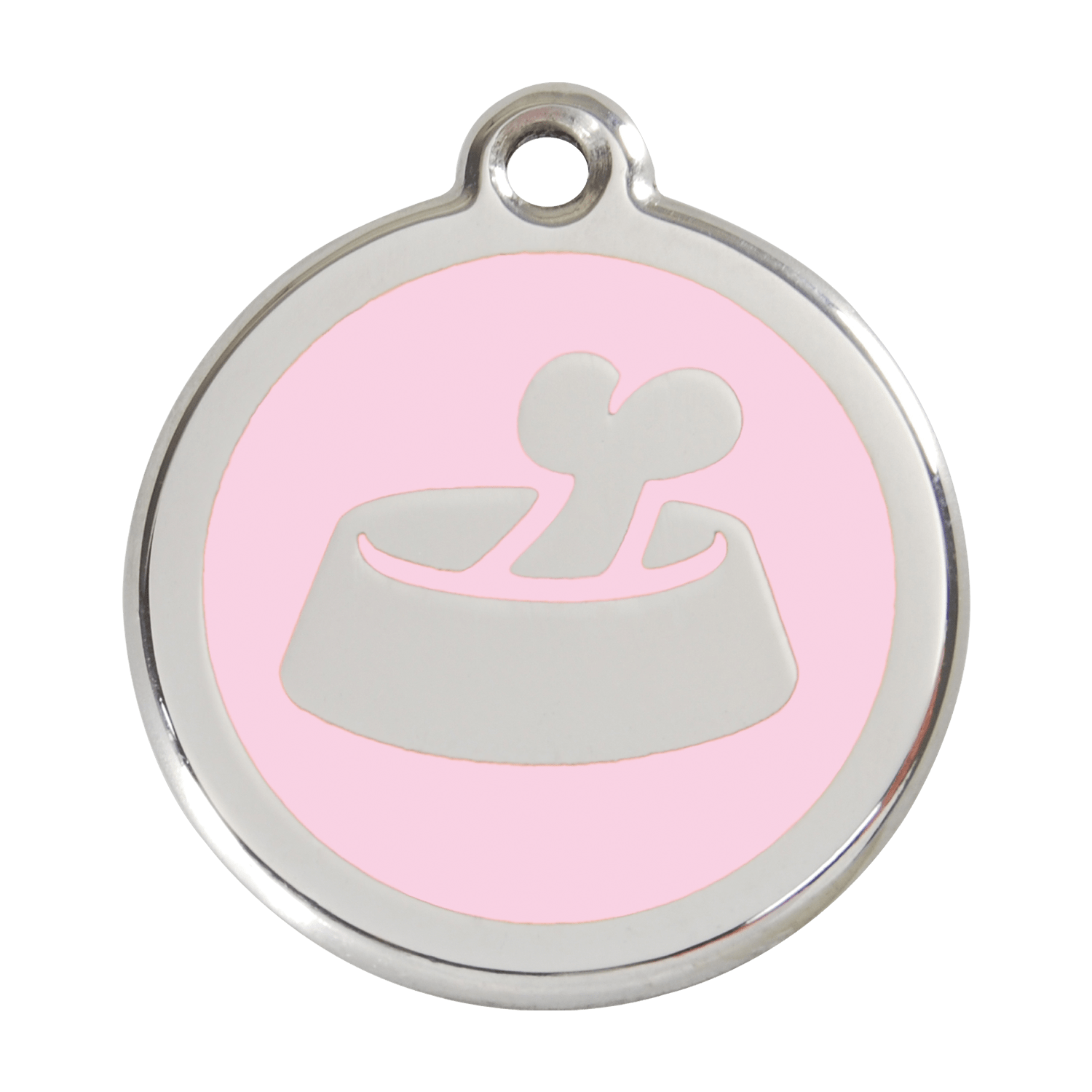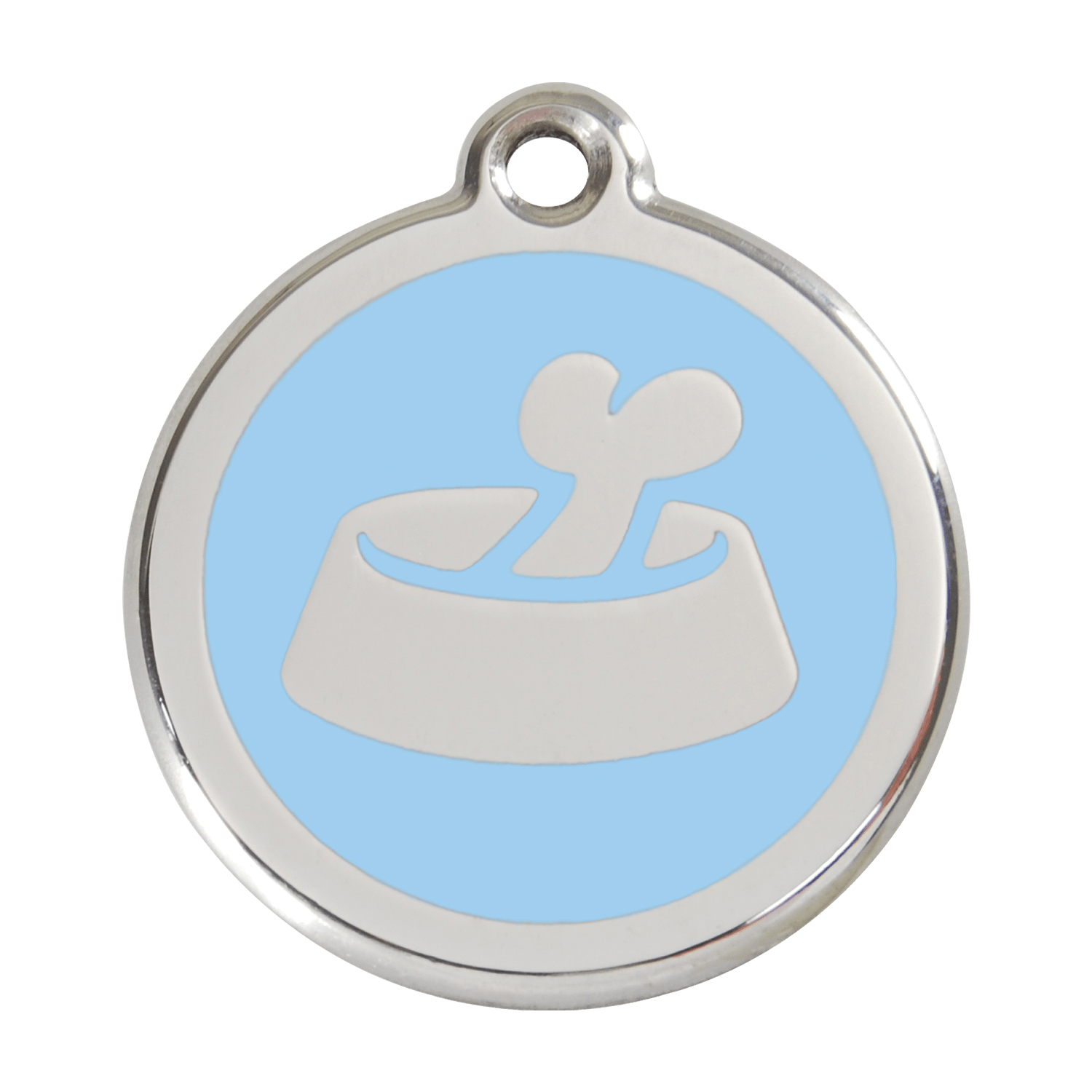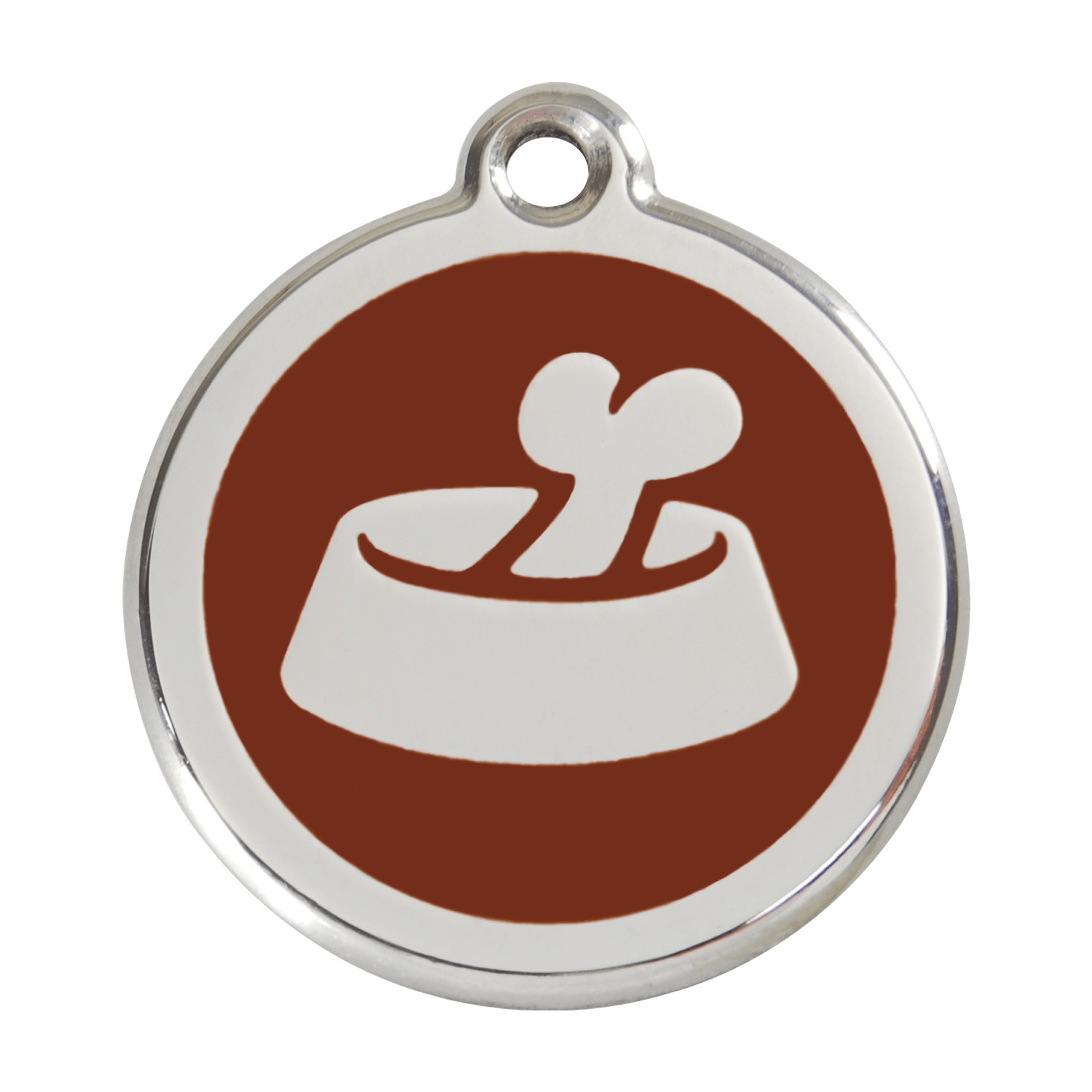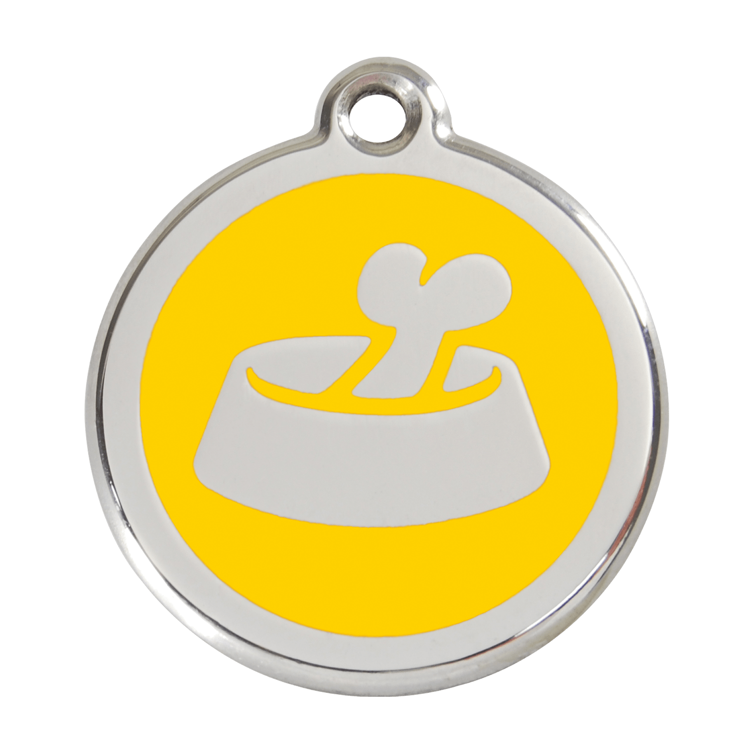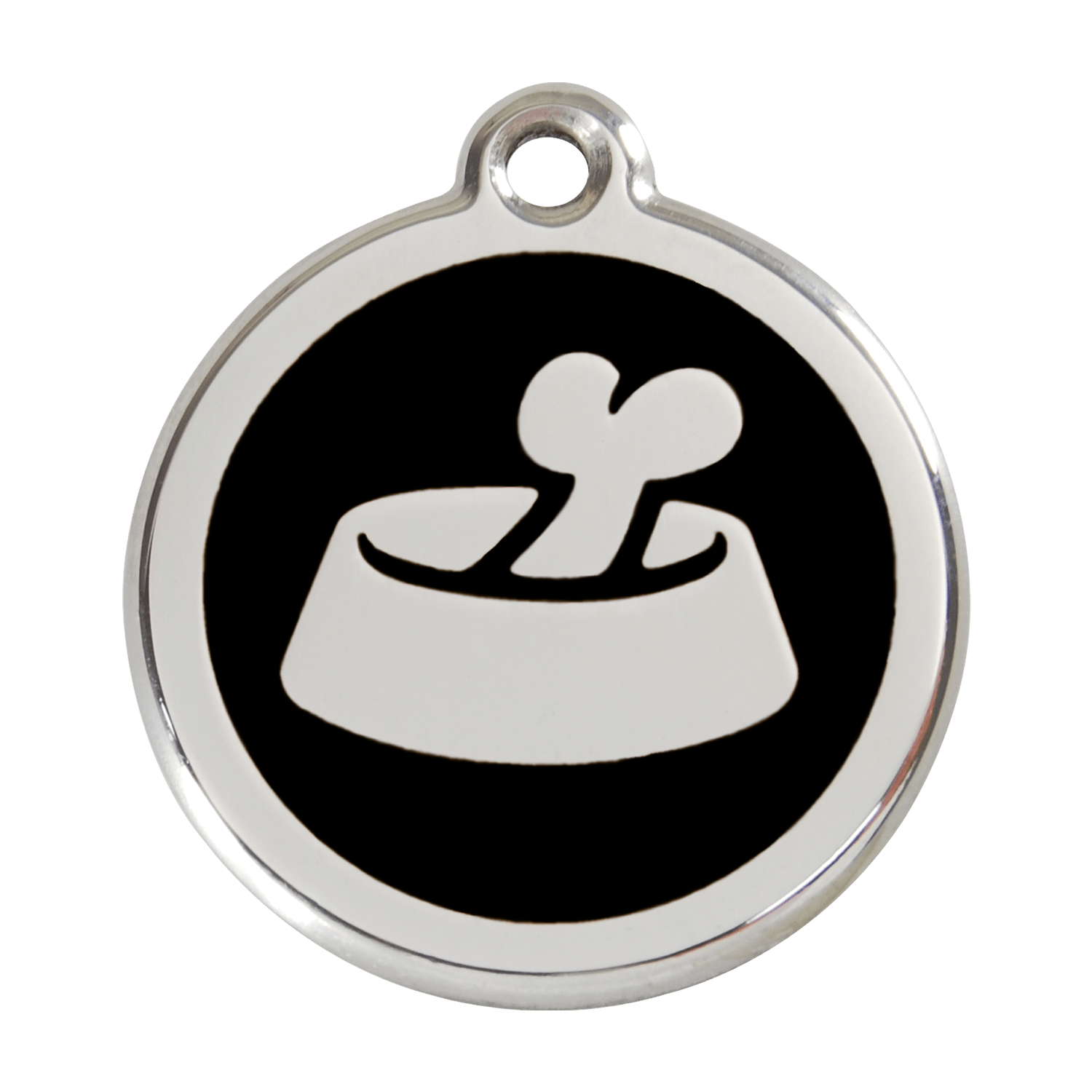 Consisting of a top quality Stainless Steel disk which is thicker than most normal ID Tags, the design is richly enamelled on the front with a white cartoon Bone in Bowl with your colour choice background.
