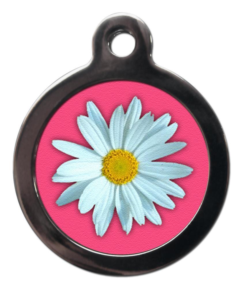 This Daisy NA15 Nature Dog ID Tag is the perfect way to show both you and your dog’s allegiance to nature and the natural world. This Tag has a beautiful colour drawing of a White Daisy with classic yellow centre on a Pink background.