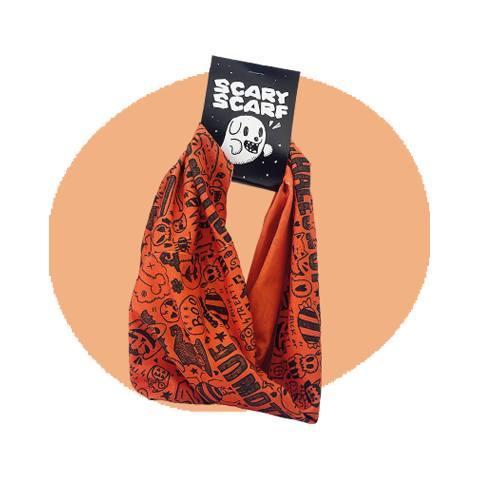 Available in three sizes, this orange scarf is made of a stretchy fabric, with seasonal pictures and words in black.