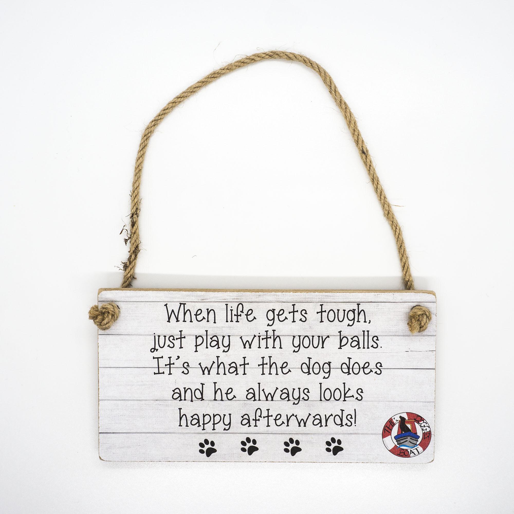 Shabby-Chic design – black text “When life gets tough, just play with your balls. It’s what the dog does and he always looks happy afterwards!” printed on a distressed white wood-effect background. Finished off with four black paw prints along the bottom and the Doggie Boat logo in the bottom right hand corner.
